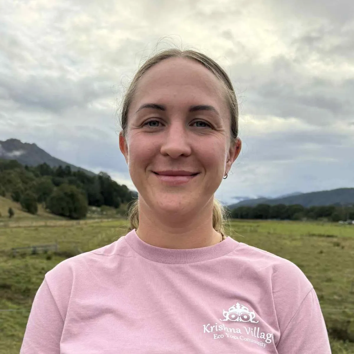 Rachel found her path in Bhakti Yoga during her yoga teacher training in 2018. Originally from the UK, she now lives in the women’s ashram at New Govardhana, where she enjoys a life of simplicity, nature, and devotional service. She’s passionate about kirtan and creating welcoming spaces where others can connect through music, yoga, and spiritual practice. You’ll find her involved in many areas of farm life—supporting volunteers, feeding cows, working in the temple shop, and leading classes. Always approachable, Rachel loves making the path of Krishna consciousness accessible to all.